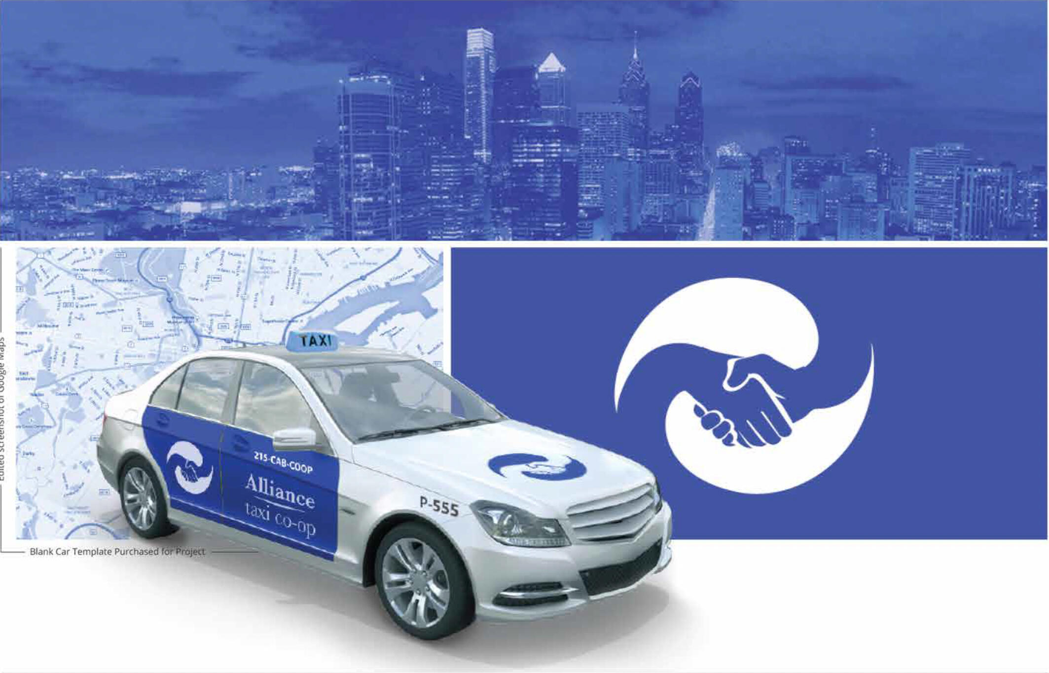 Alliance Taxi Co-op was a Philadelphia-based worker-owned taxi cooperative founded on the principle of improving working conditions and economic outcomes for its driver-members.Operating in an industry increasingly disrupted by ride-share platforms, the Co-op needed a brand that could stand apart visually while authentically communicating its founding values of solidarity and mutual ownership.Working directly with the Co-op's founders, I developed a comprehensive brand identity from the ground up, beginning with discovery conversations about the organization's mission and vision, then translating those values into a full logo design, brand guidelines, and vehicle paint designs that were approved for production across the entire company fleet.The resulting visual identity, built around a handshake motif symbolizing cooperation and partnership, gave the Co-op a recognizable, professional presence on Philadelphia's streets.
